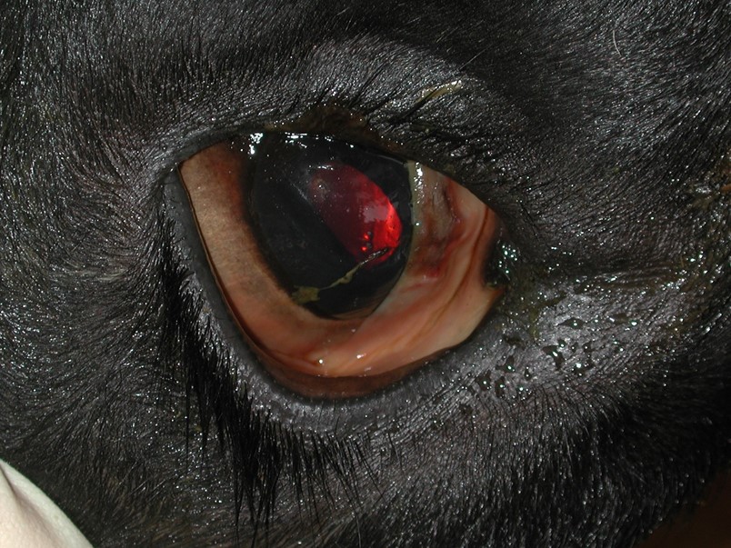 Muddy brown mucous membranes (such as seen in this eye) are typical of cows with chronic copper toxicity.