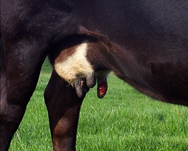 Figure 9. Self-inflicted trauma to the left fore teat in particular (licking) in response to fly irritation