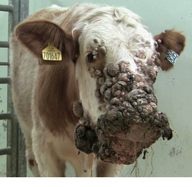 Warts are the most common tumours affecting cattle, with most cases seen on the head and dewlap between 6 and 24 months of age. Papillomas may also affect the penis, vagina and teats. The causal virus can be spread by physical contact or equipment such as halters or milking machine. Lesions vary from flat, wide based warts to cauliflower-like growths. Extensive growths that fail to resolve may be seen in immune suppressed animals (e.g. persistent BVDV infection).