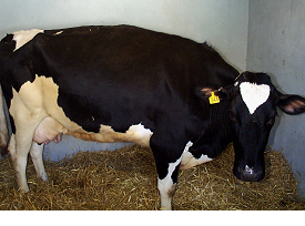 Classical clinical signs are only observed when the foreign body is in contact with the peritoneal lining of the abdominal cavity and may last only 2-3 days after which adhesions restrict reticular movement. There is sudden and complete loss of appetite, and a dramatic fall in daily milk production e.g. from 40 litres to 2-3 litres. The animal stands with an arched back and moves reluctantly, and is typically last to enter the milking parlour. The cow shows evidence of anterior abdominal pain with a taut rigid abdomen, refusal to turn sharp corners, ears back, and a fixed glazed stare. The cow is constipated and defaecation and urination are often accompanied by grunt. A pain response can usually be elicited when the cow's back is dipped behind the withers.