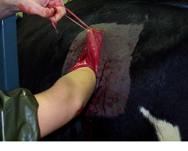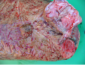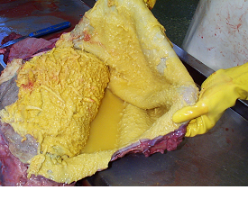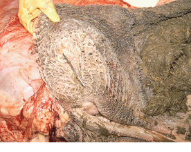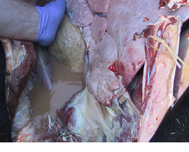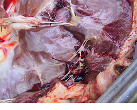Neglected traumatic reticulitis case - this cow had extensive peritonitis when presented for veterinary investigation (see necropsy findings below).