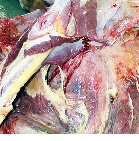 Septic pericarditis occurs sporadically in adult cattle following ingestion of sharp, usually metal objects that migrate through the reticular wall (see above) and diaphragm into the pericardial sac (surrounding the heart).