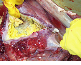 Large accumulation of pus in the sac (pericardium) surrounding the heart revealed at necrospy.