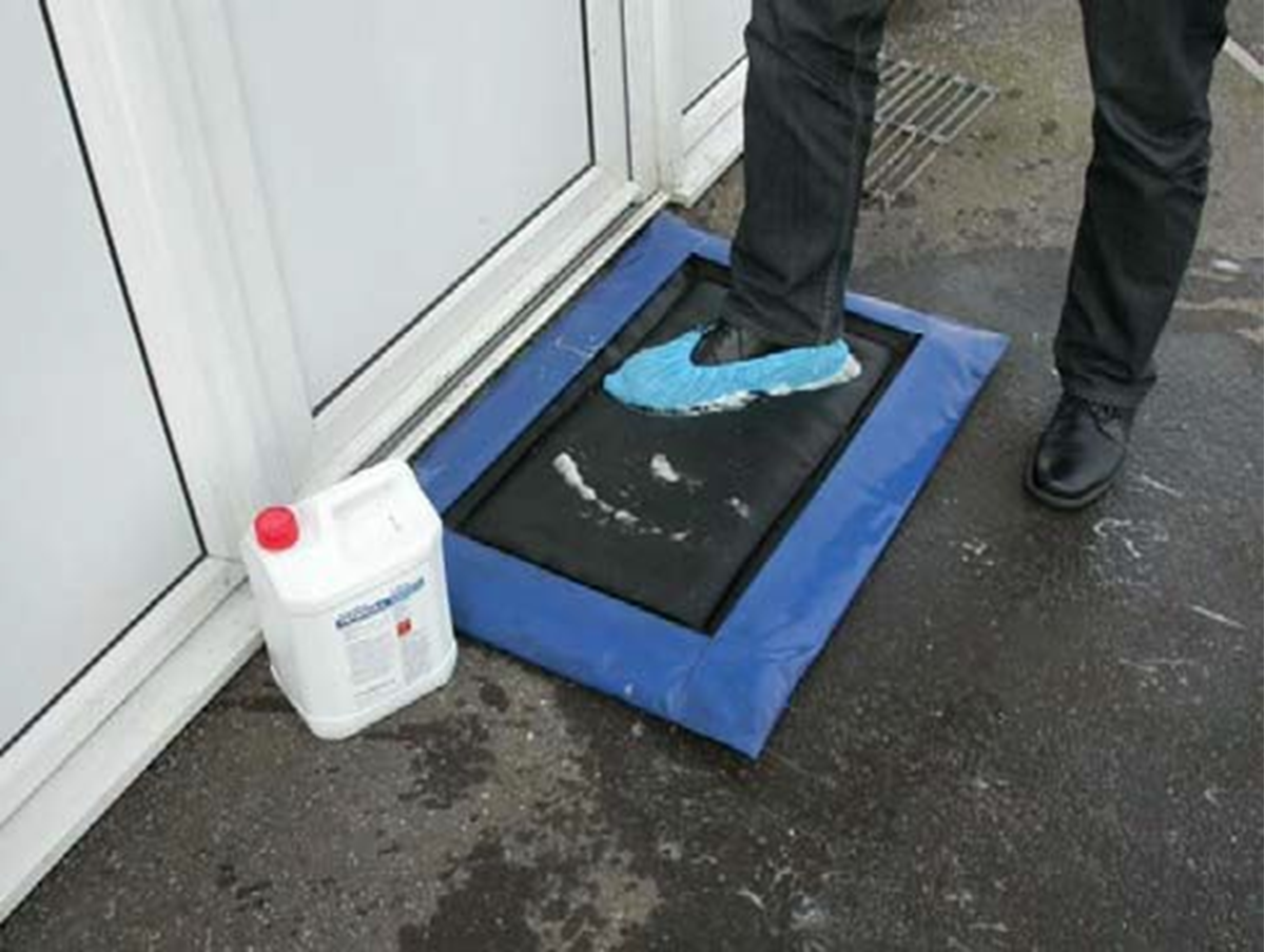 Disinfectant foot baths can be used provided footwear is water proof. Another option is to use foam filled disinfectant pads. The disinfectant should be replenished regularly. It is better to use a foaming product as you get better penetration of the grooves on the soles and also the foam carries its own protective coat with it.