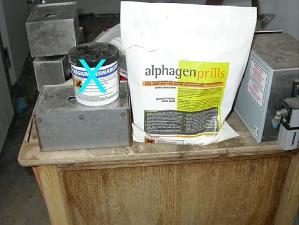 One of the most common, and cost effective, methods of disinfection is formaldehyde fumigation (Fig 12). It is vital to remember that formaldehyde vapour is extremely toxic. You must never re-enter a building or room which has been fumigated using formaldehyde until the air has been completely replaced by either natural or forced ventilation. The only safe way of producing formaldehyde vapour is electrically heating prills. Mixing formalin with Potassium permanganate crystals not only could produce an explosive mixture, but also generates intense heat, thus increasing the risk of fire.