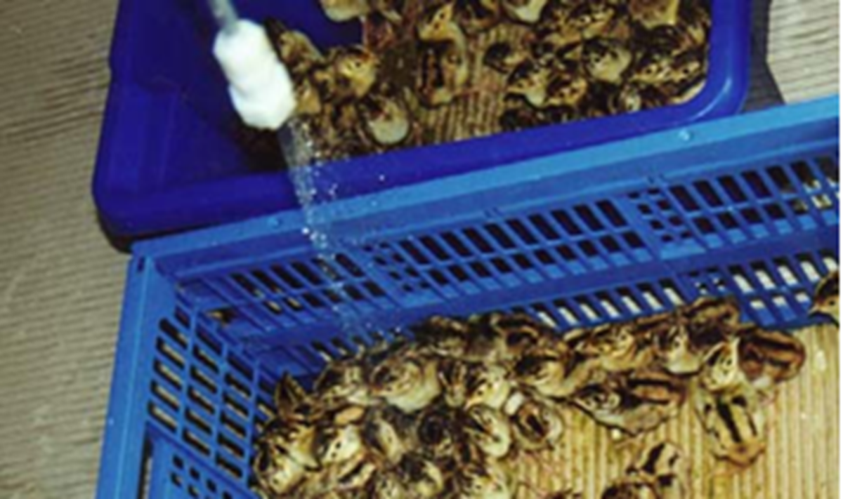 Fig 15: Vaccines and probiotics being sprayed onto chicks