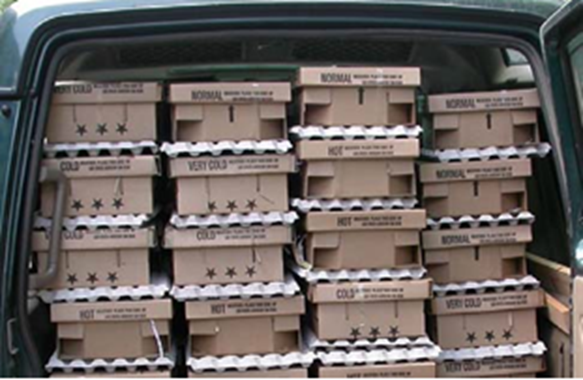 Pay very close attention to ventilation when transporting chicks. Remember that sunlight falling on vehicle windows can cause very rapid rise in temperature inside. Over-heating in transport (Fig 17) can lead to very high mortality in the first days of life.