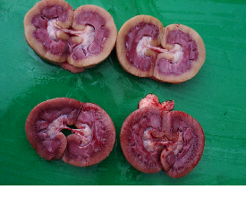 Fig 8: Necropsy reveals very pale swollen kidneys (top set) with a pair of normal kidneys below.