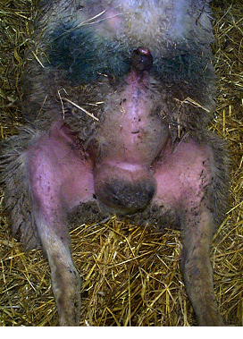 Fig 6: Rupture of the penis which has resulted in urine accumulation under the skin extending between the scrotum and the prepuce.