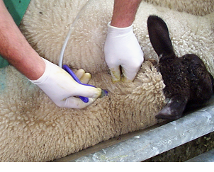 Small volumes of liquid (less than 30 mls) are frequently administered by mouth using a drenching gun (e.g. anthelmintics and flukicides, and some trace element drenches). The animal is suitably restrained with the hind quarters lodged so the sheep cannot move backwards away from the operator. The sheep's head is held with the chin up and the liquid slowly squirted over the back of the tongue. The sheep's head is released once it has swallowed the liquid.